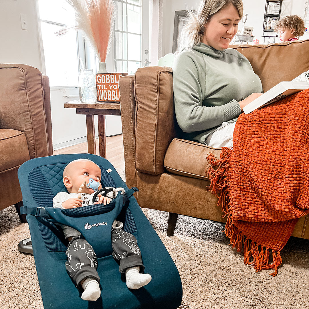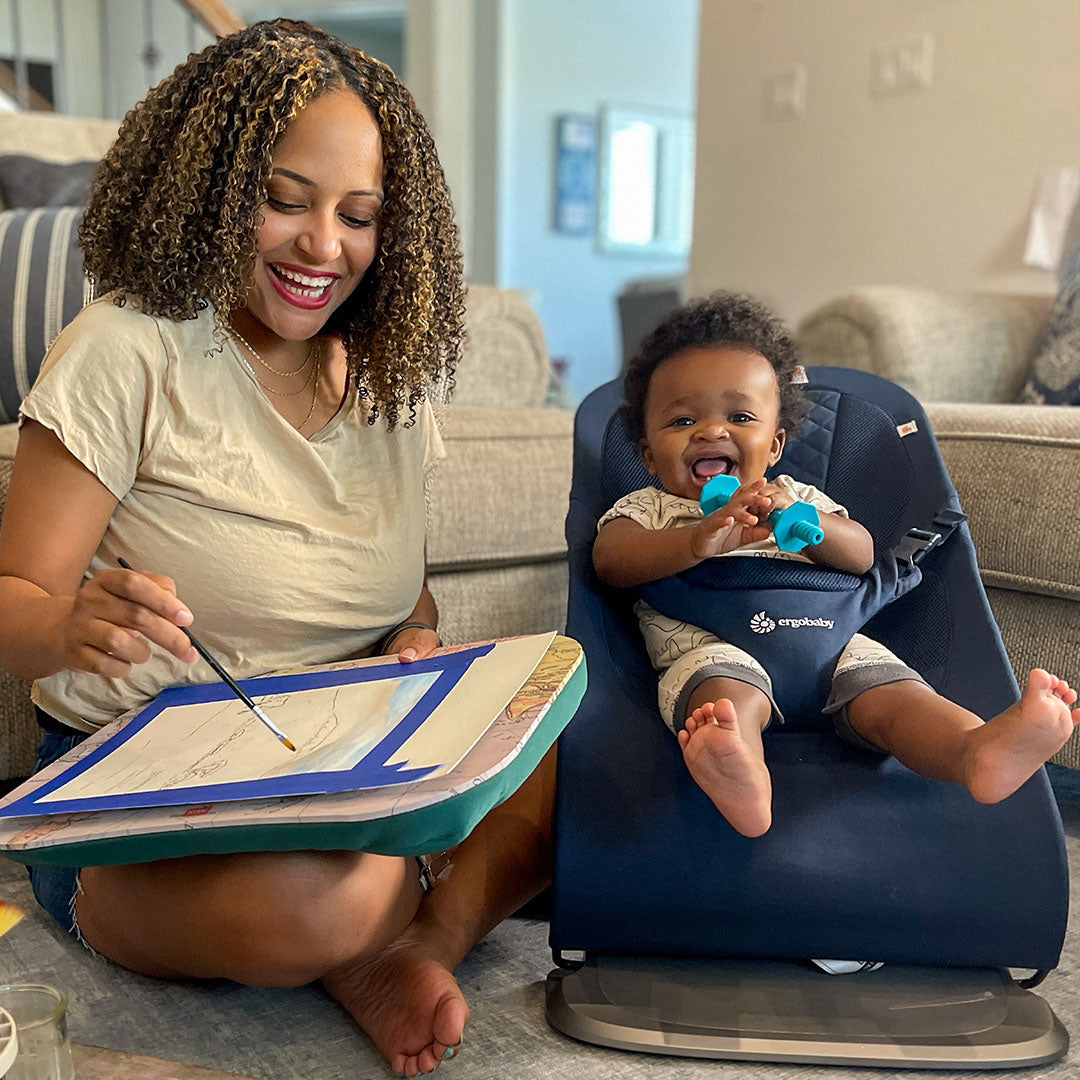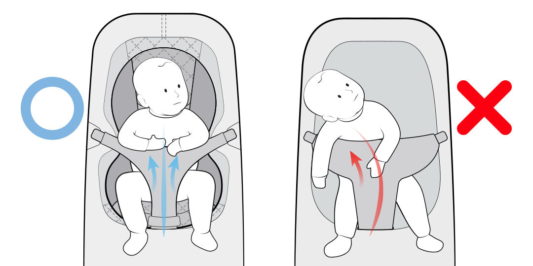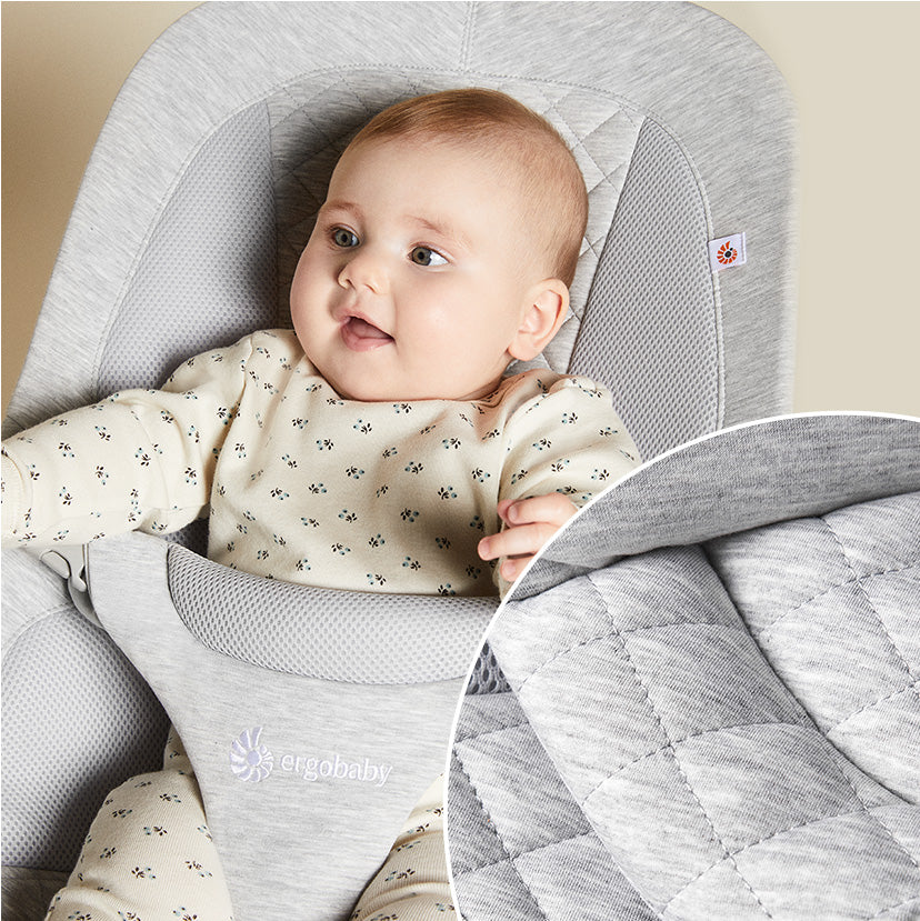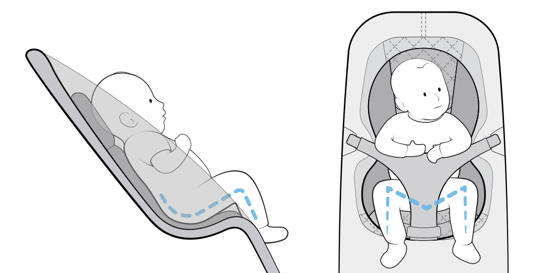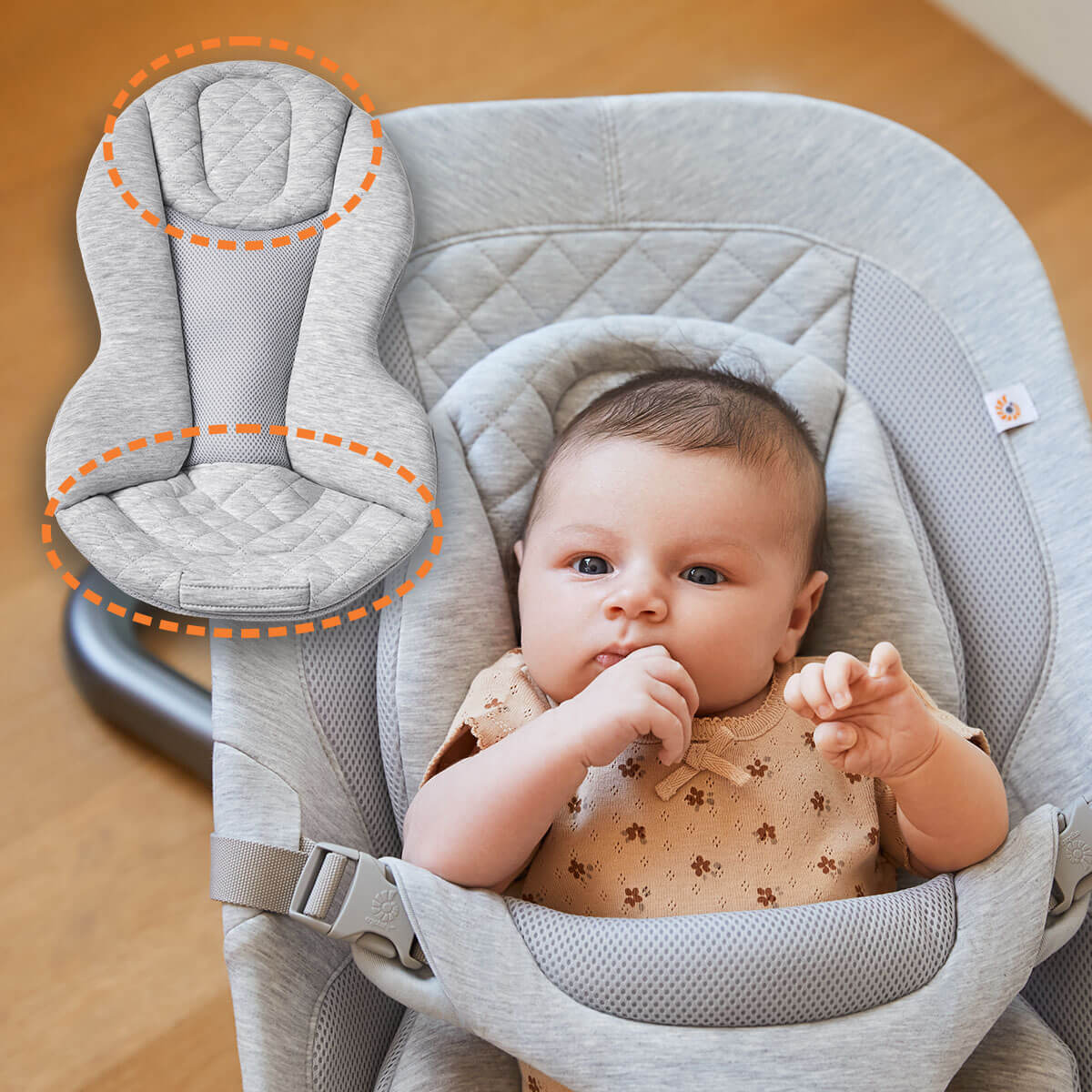 クッションの厚みや生地の切り替えで頭からおしりまでお子さまの体をやさしくつつみ込み、まるで抱っこされているかのような心地よさ