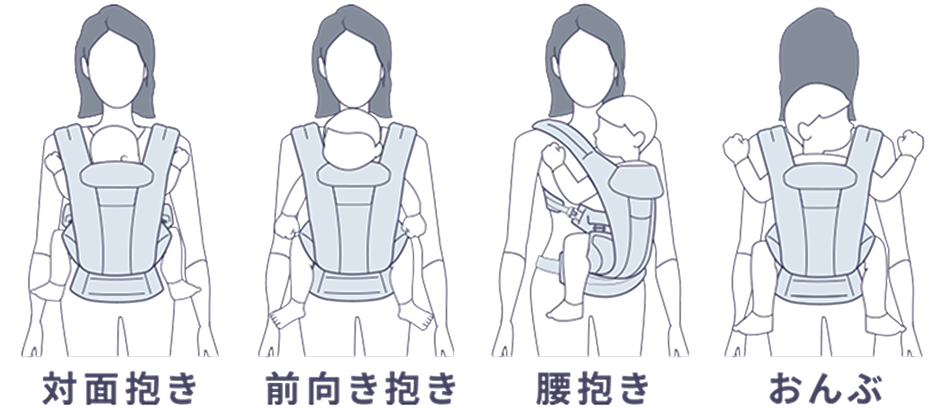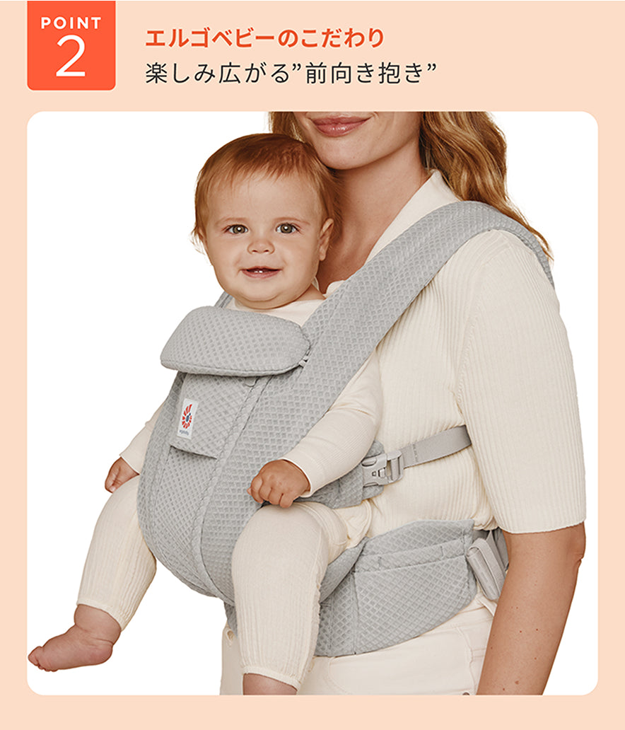 パパママと同じ景色を楽しめる前向き抱き。どの抱き方でも、M字の脚をキープできる構造です。スライダーの位置を調整するだけで簡単にモードチェンジ。