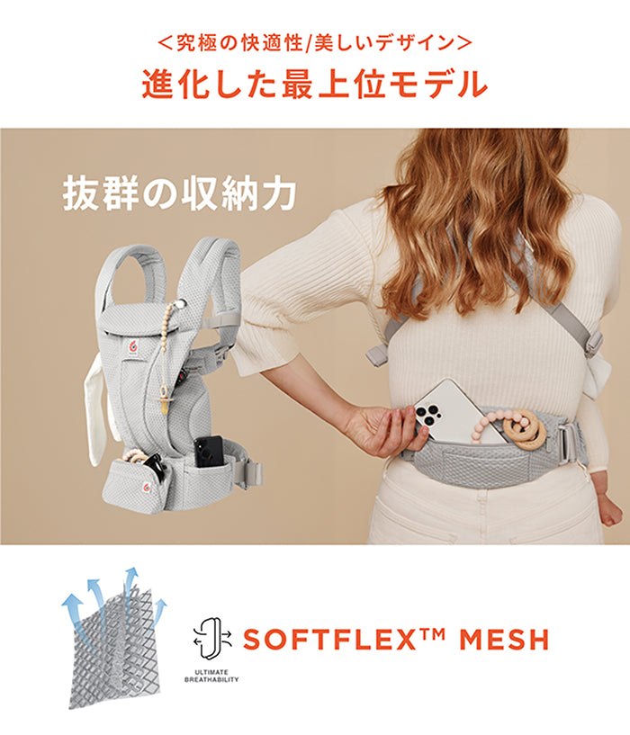 親子の快適性と、あると嬉しい機能が詰まったOMNIシリーズより新モデル登場。肌ざわりと通気性に優れたSoftFlex™メッシュを全面に使用し、デザイン性を追求。ポケットが増えスッキリお出かけ。