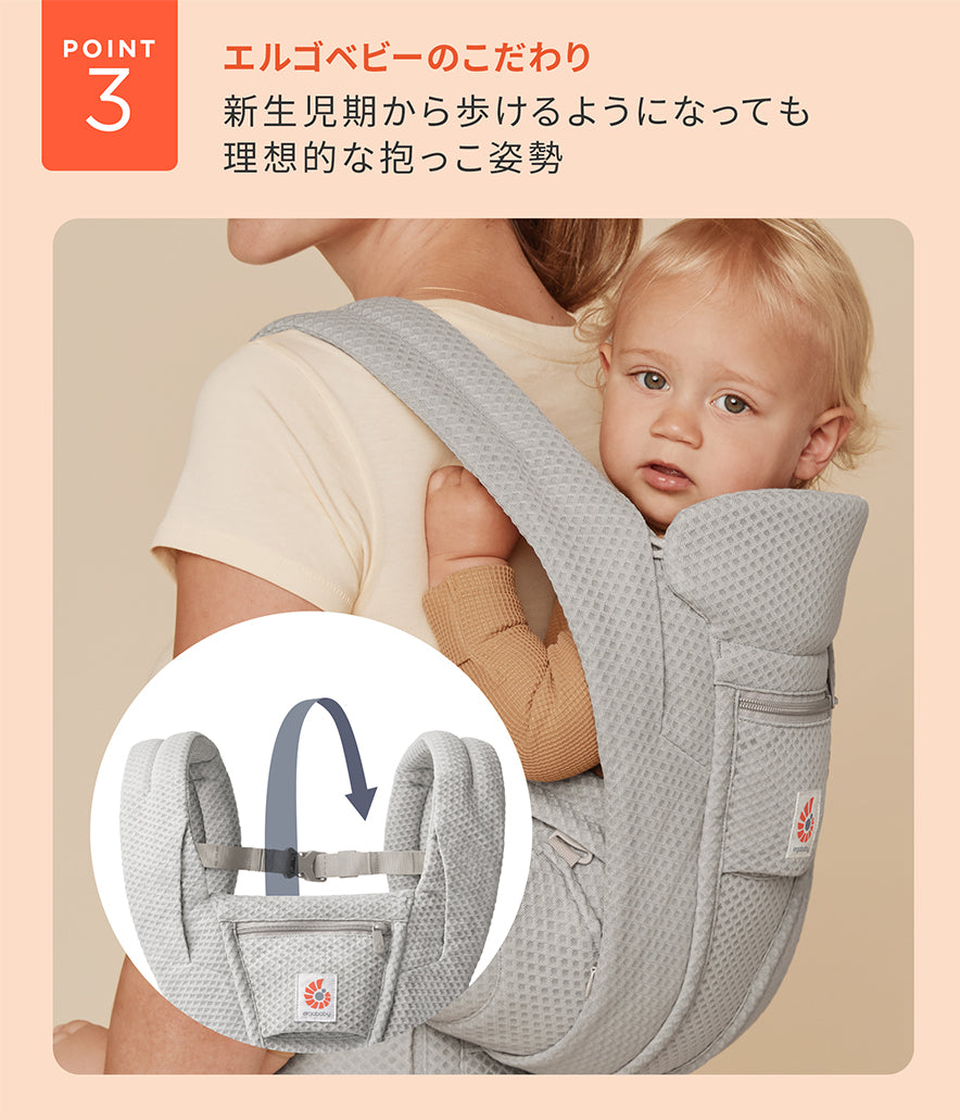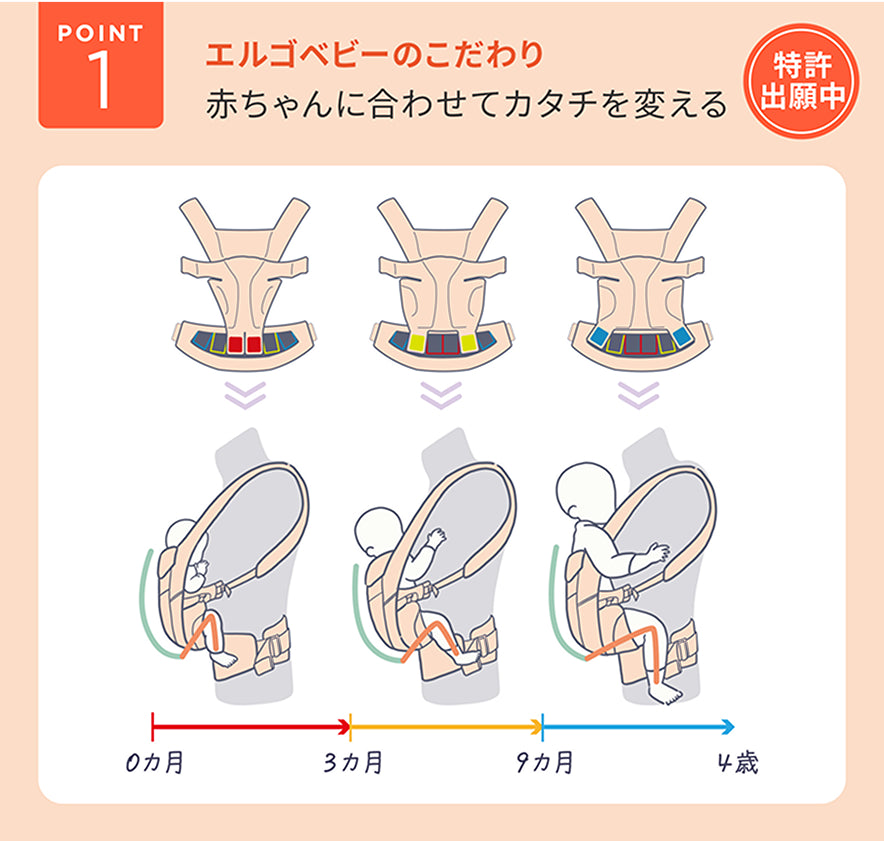 ウエストベルトの内側を調整するだけで、シートの幅とおしりが入る部分の深さが変わり、どの月齢でも自然なC字の背中と、M字の脚をキープできる構造※1。赤ちゃんを包み込むデザインだから、近い重心をキープでき体重が20kgになってもラク。