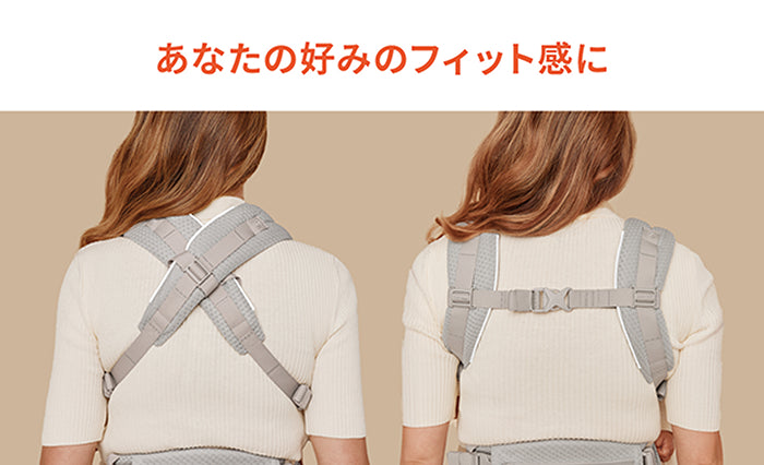 また肩ストラップとウエストベルトに荷重をバランスよく分散。小柄な方やお子さまが低月齢のときは、クロス装着もおすすめ。