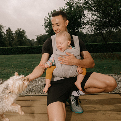 パパママと同じ景色を楽しめる前向き抱き。どの抱き方でも、M字の脚をキープできる構造です。スライダーの位置を調整するだけで簡単にモードチェンジ。